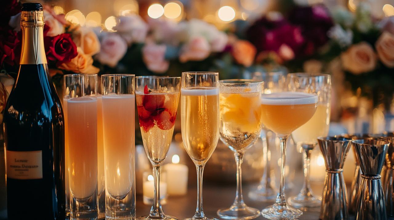 Pour les cocktails lors du vin d'honneur, un verre par personne constitue une moyenne raisonnable, soit cent cocktails pour cent invités. Optez pour des recettes peu alcoolisées comme la soupe angevine, le kir ou le punch, qui permettent de maîtriser la consommation d'alcool tout en offrant une touche festive. Cette approche contribue également à éviter les excès et à maintenir une ambiance agréable tout au long de la journée.